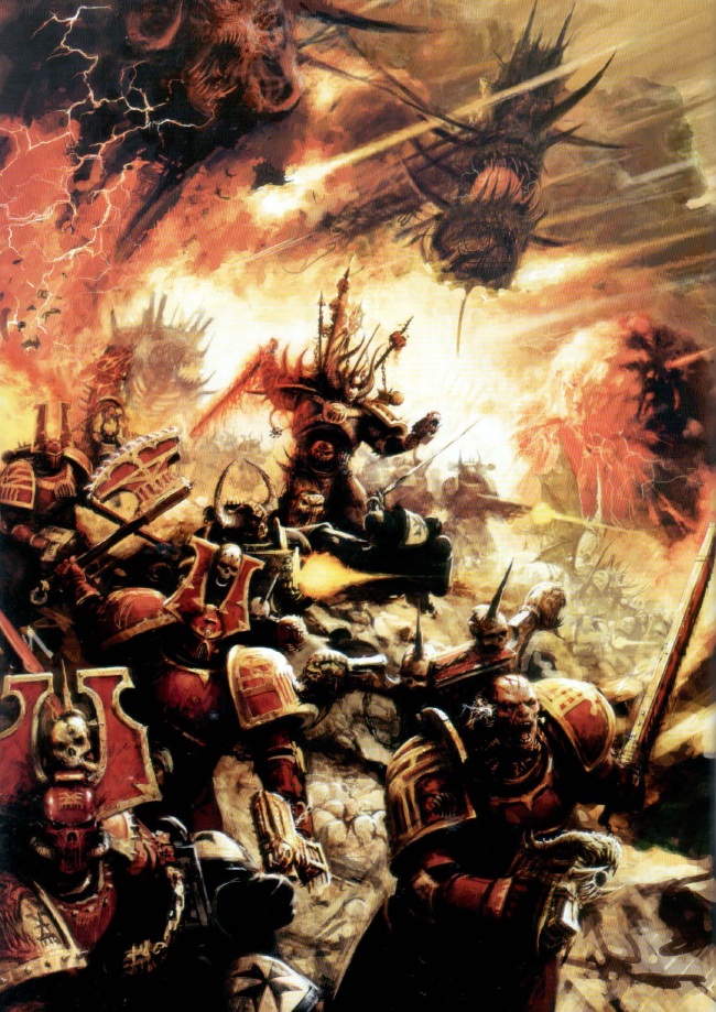 Прибытие огромного и древнего космического халка на внешнем краю системы Армагеддон ознаменовало начала первой из ужасных войн, охвативших эту планету. В этом огромном конфликте, Демонический Примарх Ангрон вёл своих Пожирателей Миров в массивном вторжении на планету-улей. Имперское сопротивление на континенте Армагеддон Прайм было быстро раздавлено, а защитники отступили за обширные экваториальные джунгли, отделявшие Армагеддон Прайм от Армагеддон Секундус. Здесь, под руководством Логана Гримнара из Космических Волков, Имперские силы устроили новую линию защиты и ожидали возобновления атаки. Самодовольный Ангрон, уверенный, что кампания выиграна, потратил недели на воздвижение великих храмов и монолитов своего покровителя — Кхорна, или так казалось. На самом деле, локальный Варп-Шторм, позволивший призвать большую часть его армии, рассеивался, а без его влияния, все демоны из его войска скорее всего были бы утянуты обратно в Варп. Поэтому окружение Ангрона было вынуждено возводить монументы и храмы. И это оказалось ошибкой.