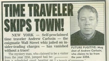 В 2003 году газета Weekly World News (WWN) опубликовала статью о человеке, который был арестован 28 января 2003 года в США по подозрению в мошенничестве при игре с ценными бумагами. Арестованный представился, как Эндрю Карлсин, указал возраст — 44 года, а свою успешную игру на рынке акций объяснил тем, что он прибыл из 2256 года, воспользовавшись машиной времени.
