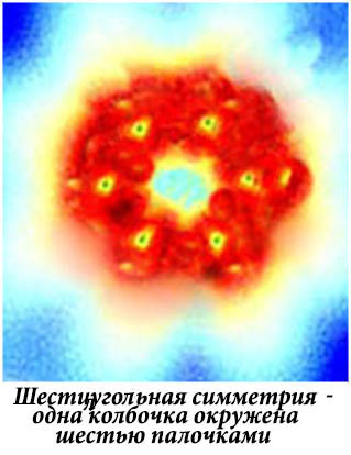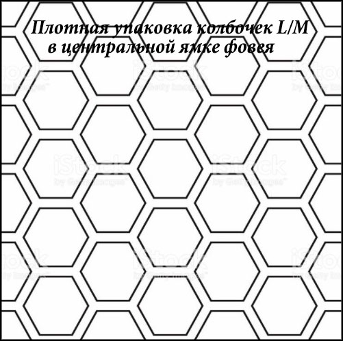 - 4) В первом поясе — центральной ямке расположены только красные и зелёные колбочки (M.,L) без палочек, в пределах остальных поясов (второй, третий) расположены колбочки и палочки. При этом в радиусе 1,13 мм от центра, начало периферийной зоны очень плотно расположены Колбочки-S (синие) и остальные колбочки и палочки с фиксированной мозаикой расположения. По мере удаления от центра центральной ямки градиент плотности расположения колбочек уменьшаетя с иэменением их размеров, особенно внешней мембраны в сторону уменьшения диаметра поперечного сечения мембраны. (Это связано попадающими лучами света с меньшей длиной волны, но в пределах более 498 нм).