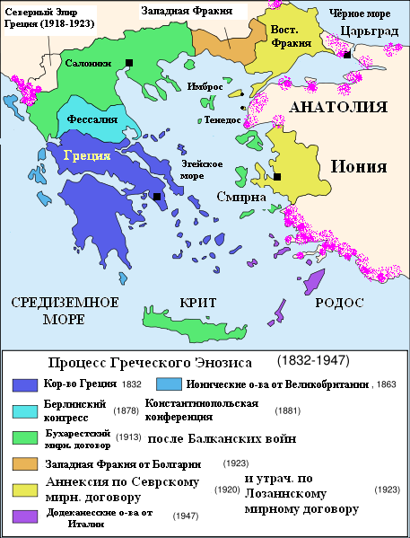 С 5 мая 1919 по 10 ноября 1922 гг. продолжалась греко-турецкая война, греки наступали из Смирны в глубинные районы Малой Азии, почти дошли до Анкары, но были разбиты войсками Мустафы Кемаля, а затем и вообще вибиты из Малой Азии. Территориальные приобретения Греции во Фракии и Малой Азии (за счет Турции) были аннулированы условиями Лозаннского мира с Турецкой республикой от 24 июля 1923 года.