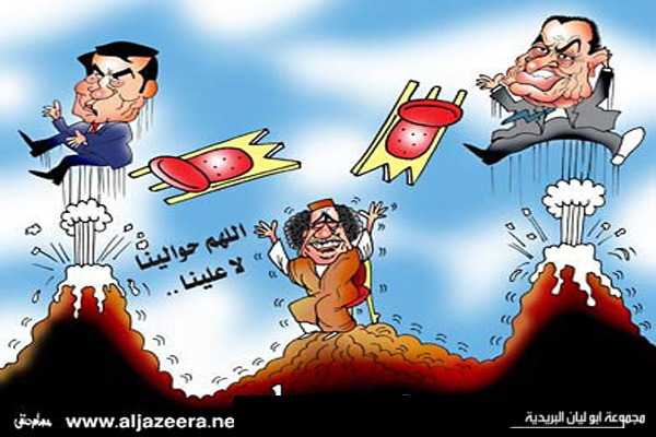 15 февраля начались столкновения между полицией и противниками правительства в Ливии. Протестующими выдвинуты требования об отставке Кадаффи и правительства. 18-19 февраля развернулись бои между армией и демонстрантами. По митингующим стреляли из крупнокалиберного оружия. В стране был отключен Интернет. Сообщалось о 200 погибших в ходе первых дней противостояния, затем говорится о тысячах жертв среди повстанцев и сторонников Каддафи. В конце февраля повстанцы занимают ряд городов на западе Ливии, целиком восток Ливии. В Бенгази организуется Национальный Переходный Совет, управляемый оппозицией. В марте проходит ряд сражений между силами Каддафи и повстанцами. Переменный успех в действиях обеих сторон. 19 марта в войну вмешивается международное сообщество в лице НАТО и ЛАГ. Начинаются бомбардировки объектов ПВО и войск Каддафи. С 25 марта начинается контрнаступление оппозиции.