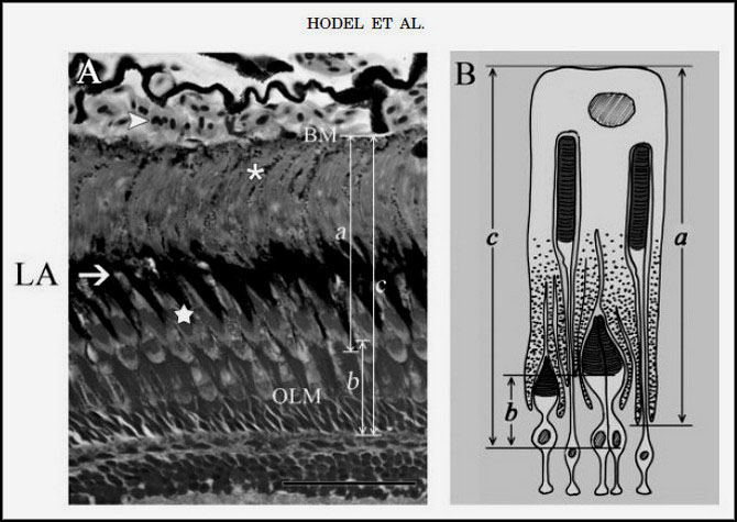 Слева — микрофотография сечения сетчатки глаза рыбы, справа — схематическая прорисовка взаиморасположения органелл и фоторецепторов. Направление света, приходящего в сетчатку сквозь хрусталик: снизу-вверх.
