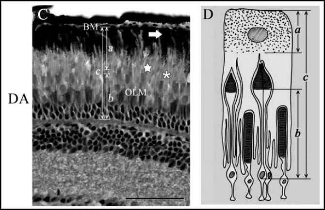 В 2006[9] году при помощи трансмиссионной электронной микроскопии пигментного слоя сетчатки исследован эпителий клеток сетчатки глаза, где вырабатывается пигмент меланин (коричневого и чёрного цвета), который обеспечивает открытие и закрытие зон освещения колбочек и палочек в зависимости от вида освещения. При дневном освещении данный пигмент блокирует работу палочек, которые ко всему ещё уходят в зону под колбочки. И наоборот, при сумеречном освещении палочки выходят из под прикрытия зоны прохождения синих и ультрафиолетовых лучей меланином, а колбочки опускаются в зону ниже палочек и находятся под прикрытием меланина. (См. рис. C). В конечном итоге подтверждено открытие явления ретиномоторной реакции фоторецепторов, работы колбочек и палочек в условиях дневного и ночного освещения учёными Е. О. Загальской и В. П. Гнюбкиной из Института Биологии Моря ДВО РАН, Владивосток.