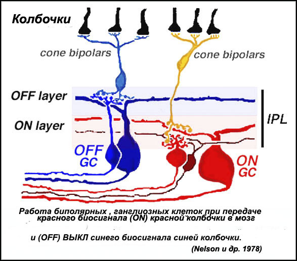 - Исследована и показана работа колбочек и палочек в условиях ВКЛ(ON) и ВЫКЛ(OFF), которые между собой напрямую не связаны, а работают через амакриновые, билолярные и ганглиозные клетки сетчатки глаза (см. Фиг.18).