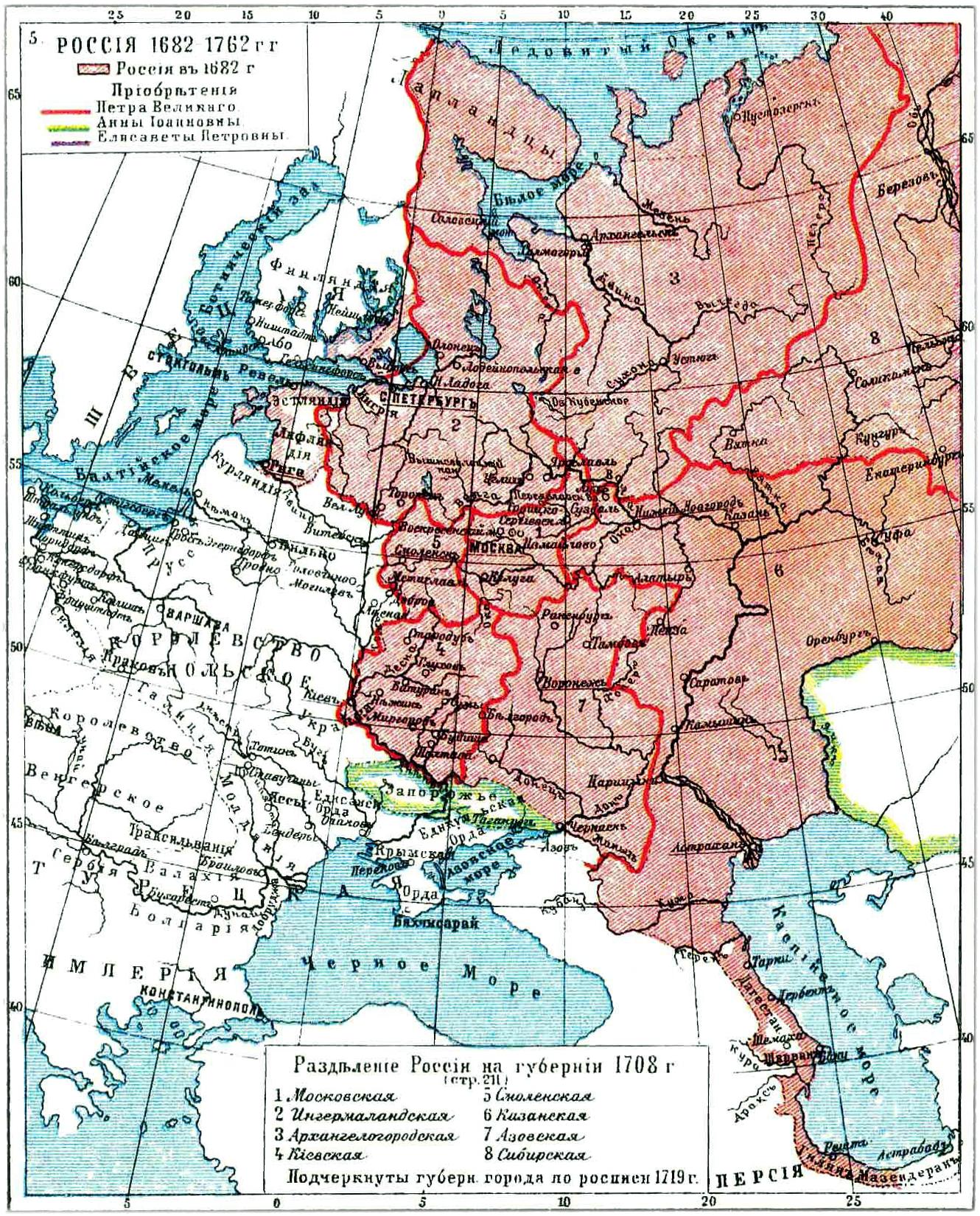 С 1719 года основной административной единицей стала провинция[Прим. 14], которой управляли подотчётные Сенату и коллегиям провинциальные воеводы. За губернаторами оставили обязанность управления губернским городом и командования армейскими полками, расквартированными в губернии. При этом во многих окраинах государства (Сибирь, Малороссия, Прибалтика) ещё долгое время сохранялись прежние институты власти[22][24][25].