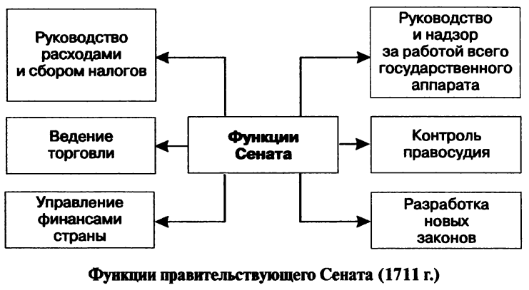 Изначально Сенат был учреждён как высший орган государственного управления на время отсутствия императора. Он обладал судебными функциями, занимался вопросами финансов и через губернаторов контролировал действия местных властей[4][22][24].