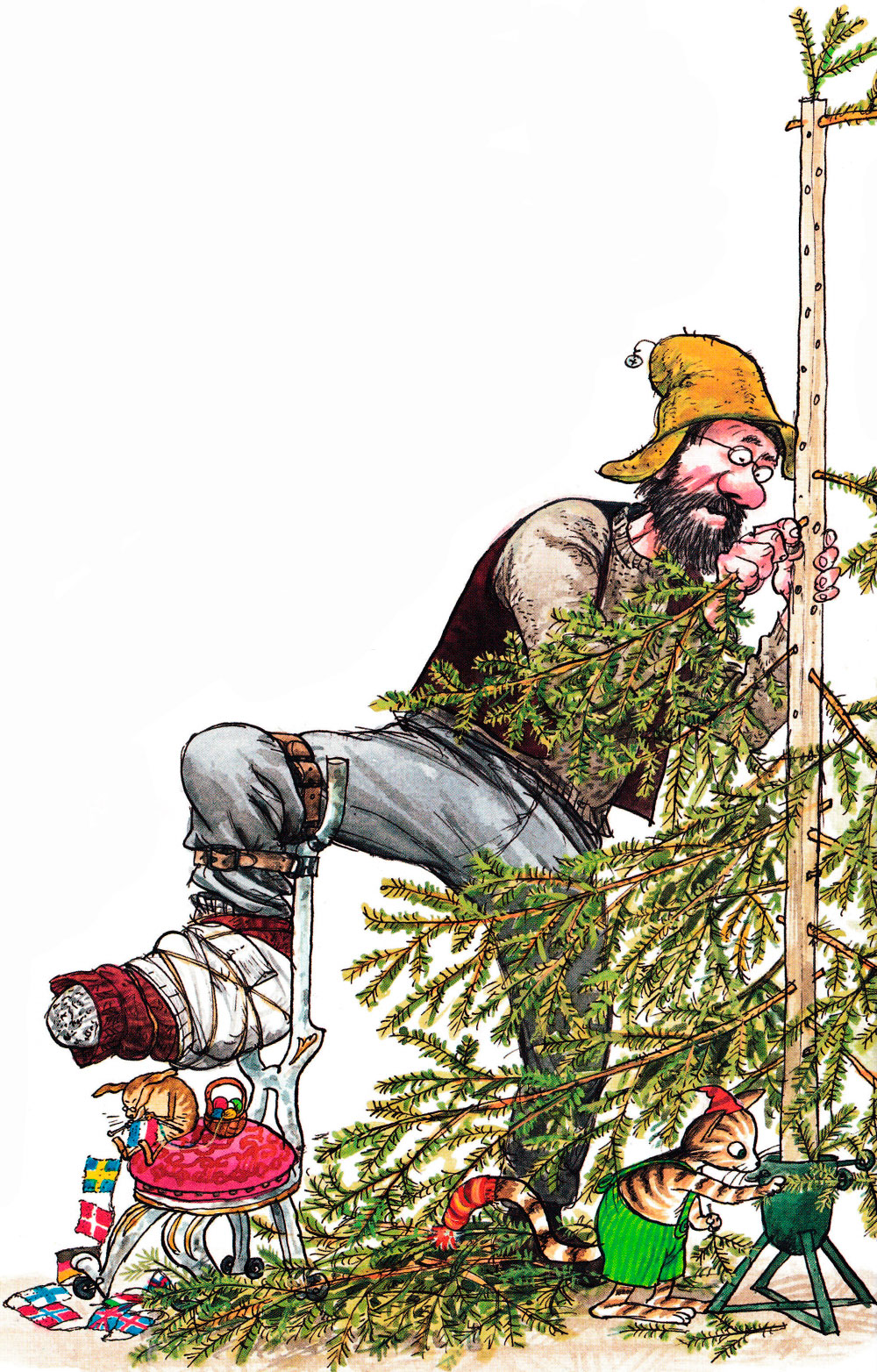 Нурдквист думает одновременно и как писатель, и как художник. Его рисунки не просто иллюстрируют текст, а рассказывают ту же историю, дополняя её новыми подробностями. Собственно, о том, как сильно болит у Петсона нога и как она его донимает, нам сообщают именно рисунки. И падение Петсона с санок на рисунках предстаёт с особым драматизмом, который ещё усиливается изображением восторгов Финдуса по поводу незапланированного катания. И о том, с каким нетерпением, с какой надеждой котёнок ждет Рождества, нам сообщают картинки: там Финдус уже нарядился. На голову надел один красный колпачок, на хвост — другой.
