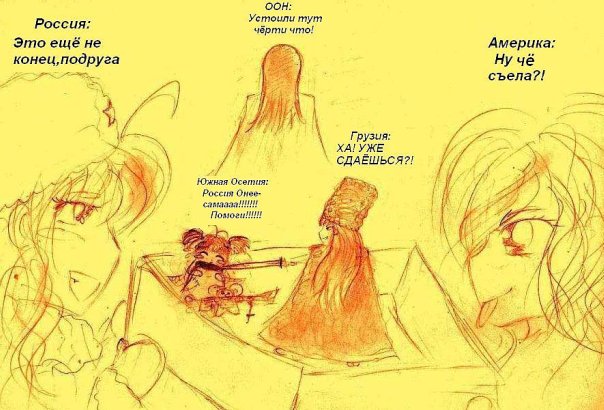 Также появились и производные карикатуры, например, картинка, на которой Россия-сама, Америка и девочка ООН отпускают реплики насчёт нападения Грузии на Южную Осетию в 2008 году, а Южная Осетия просит Россию-онее-саму о помощи.