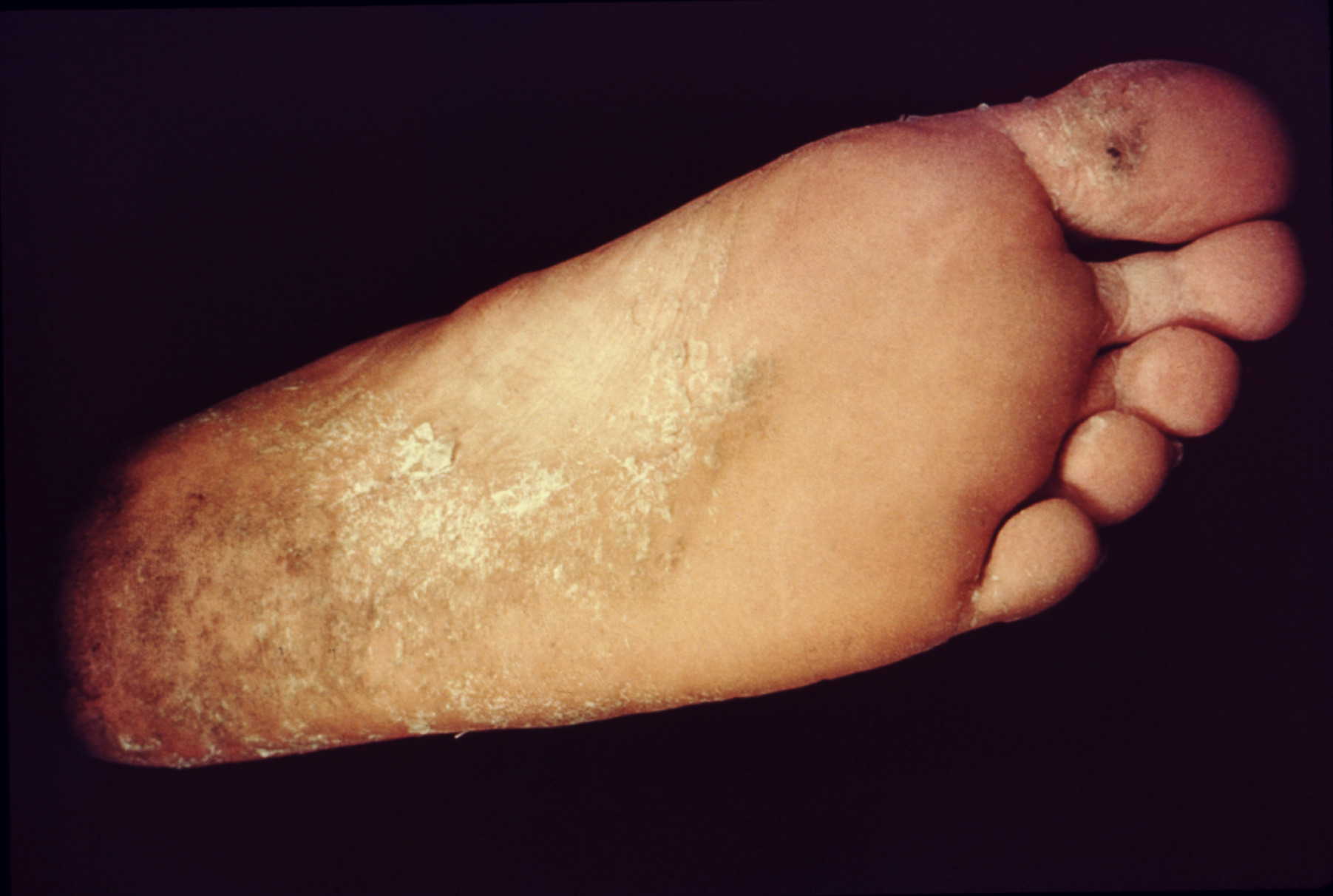 Выделяют следующие клинические формы микоза стоп: сквамозную, гиперкератотическую, интертригинозную, дисгидротическую. Сквамозная форма проявляется сухостью и шелушением на коже межпальцевых складок и подошв. Могут развиваться небольшие поверхностные трещины. На боковых поверхностях стоп происходит десквамация эпидермиса. Иногда больные отмечают непостоянный и незначительный зуд. В связи с отсутствием выраженных симптомов эта форма может длиться годами из-за незамеченности пациентом[5].