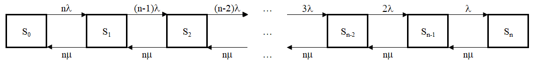 — это система массового обслуживания, в которой есть n-каналов, n-источников заявок и между каналами полная взаимопомощь. Поток заявок каждого источника имеет одинаковую интенсивность. Первоначальный поток заявок имеет интенсивность большую в n-раз, чем поток заявок от одного источника. Каждое поступление заявки, снижает интенсивность входного потока на интенсивность потока от одного источника. Если заявка приходит, в момент, когда все каналы свободны, то она немедленно поступает на обслуживание всеми каналами. Если заявка приходит, в момент, когда заявок меньше, чем каналов, то она немедленно поступает на обслуживание, причём все каналы распределяются между всеми заявками. Если заявка приходит, в момент, когда заявок столько же, сколько каналов, то она не обслуживается (т.е. теряется). Максимальное число заявок в системе равно числу каналов.