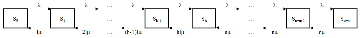 - Заметим, что при n>l>0,m>0,λi-1=λ,μi=ilμ,i=1,h,λj-1=λ,μj=nμ,j=h+1,n+m система массового обслуживания становится СМО n-канальной с m-очередью и с частичной взаимопомощью.