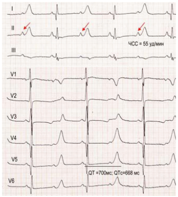 - выраженное удлинение QT-интервала до 480-700 м/с;