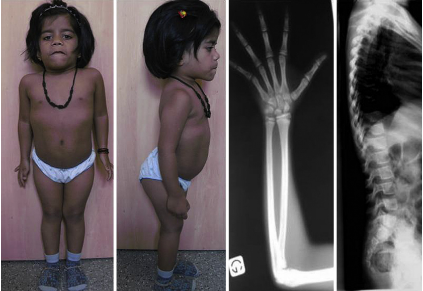 - грудная клетка широкая с тонкими и горизонтально расположенными рёбрами. Кости таза малы, особенно лобковая и седалищная кости, с развёрнутыми подвздошными крыльями и малыми запирательными отверстиями. Костный возраст может быть незначительно задержан или соответствовать норме;