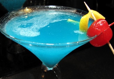 В шейкере со льдом встряхнуть джин, голубой Кюрасао, сок половины лимона и чайную ложку мараскина.