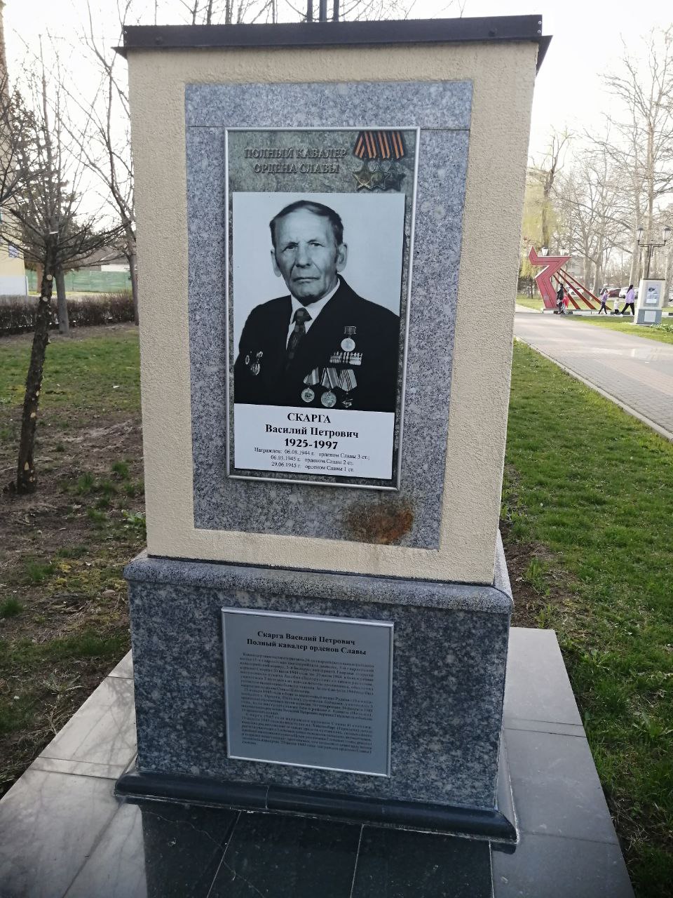 - ↑ 1,0 1,1 1,2 1,3 Кравец Т. На Аллее Героев в Тихорецке будет имя Василия Скарги. Тихорецкие вести (2015-06-08). Проверено 3 апреля 2024.