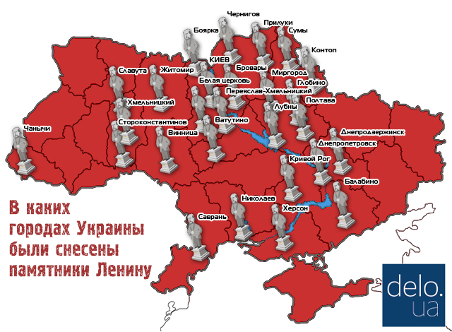 - Черкасская область — тотальный демонтаж Ленина во всех районных центрах.