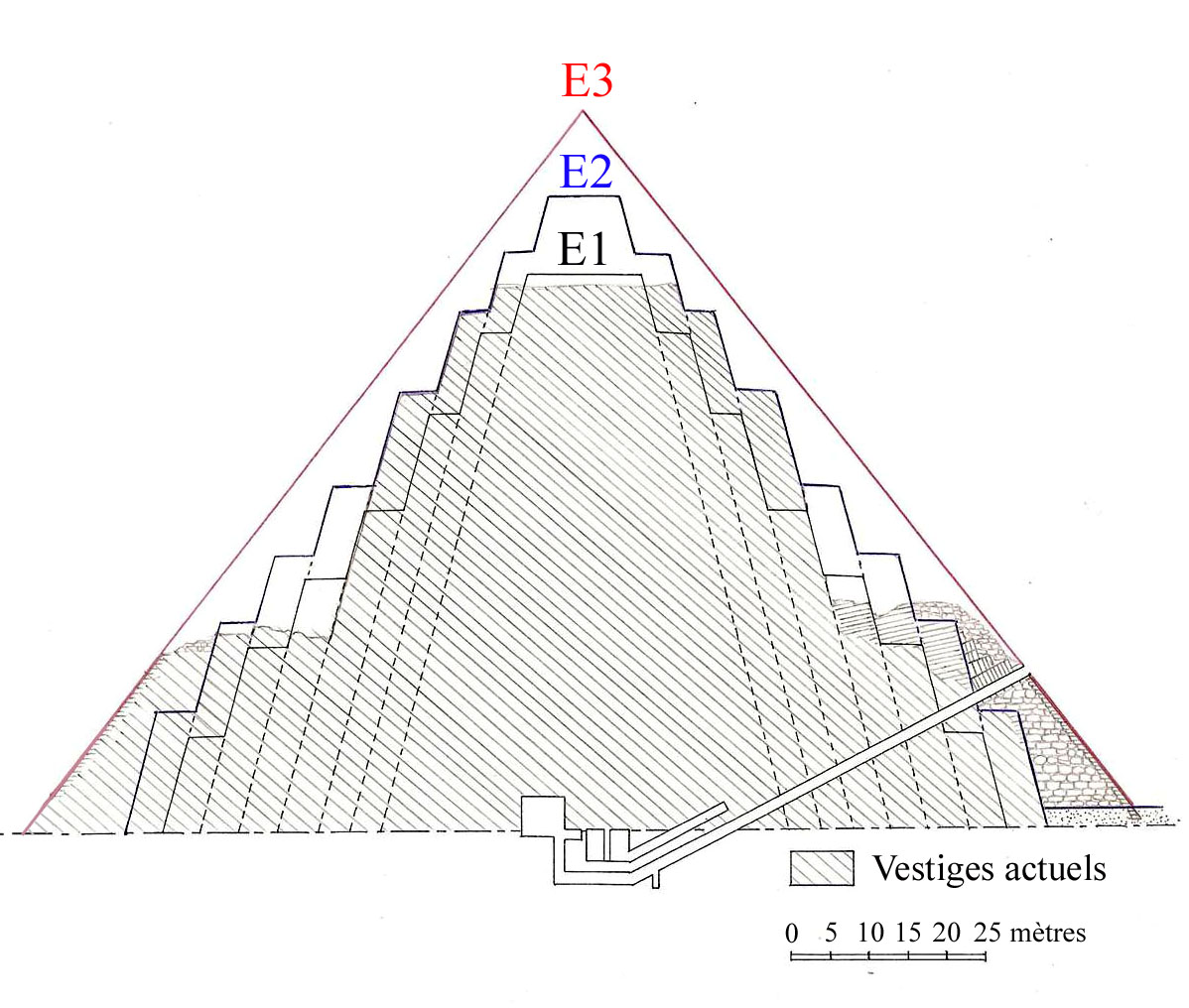 Первоначально эта пирамида была построена как ступенчатая и лишь на третьем или четвёртом этапе строительства её превратили в «истинную», заполнив уступы каменной кладкой. Реконструкция её архитектурной эволюции была для современных учёных нелёгкой задачей, и кто знает, как долго она оставалась бы неразрешённой, если бы на помощь египтологам не пришёл неизвестный древнеегипетский строитель[стиль]. При раскопках на известняковой плитке был обнаружен стилизованный чертёж, изображавший пирамиду сначала с двумя, а потом с тремя и четырьмя ступенями. Выполнил этот чертёж какой-то древний «прораб». К сожалению[стиль], не нашлось записи с его именем, неизвестно также, кому и когда пришла в голову идея заполнять уступы каменной кладкой и покрывать возникший таким образом ровный склон пирамиды сплошной облицовкой. Не сохранилось и прямого свидетельства о том, какой египетский царь повелел построить эту пирамиду.