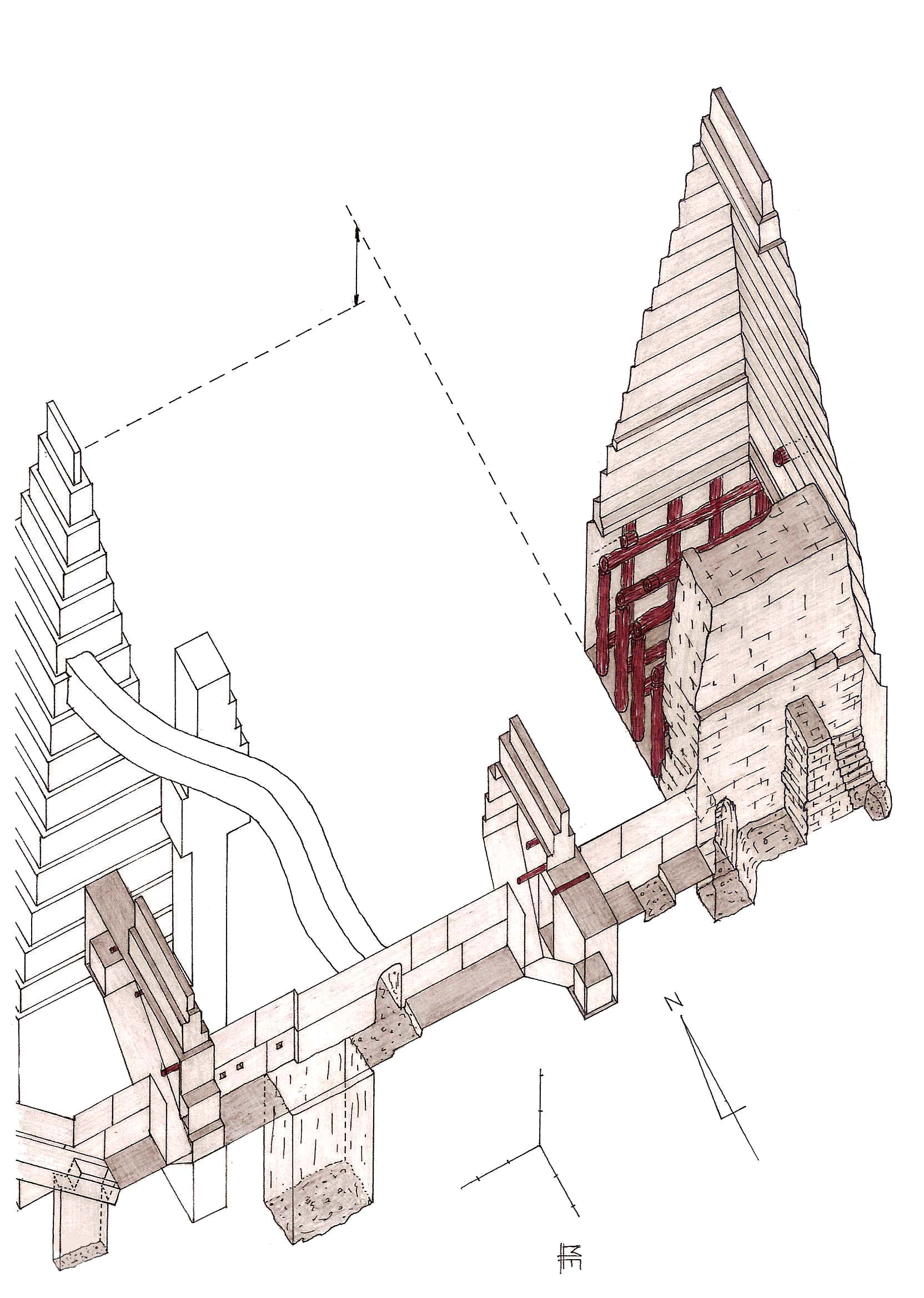 Для её строительства использовались такие большие блоки, что рабочие не могли их поднять; возникла проблема, как их доставить на нужную высоту. Борхардту удалось в начале прошлого века найти возле неё остатки платформ или насыпей, по которым каменные блоки доставлялись наверх. Подобную же находку в тридцатые годы сделал А. Роу; найденные им остатки платформы видны и поныне. Таким образом, подтвердилась правильность давнего сообщения Диодора, согласно которому тогдашние строители переправляли камни наверх «с помощью насыпей, ибо приспособления в ту пору ещё не были изобретены».