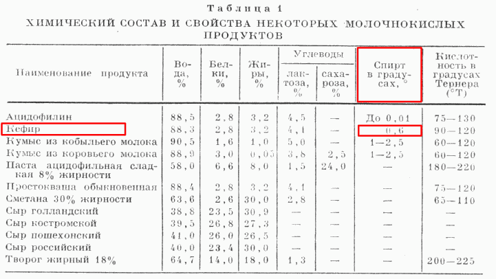 ГОСТ-а на кефир 1956 года, «Большой медицинской энциклопедии» (БМЭ) и других источников, содержание алкоголя в кефире может составлять от 0,2−0,6 % и выше