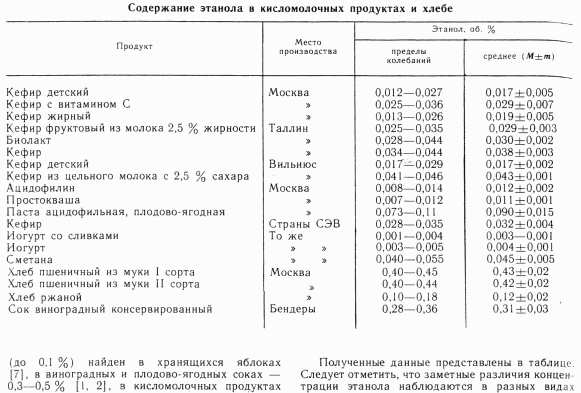 Авторы журнальной статьи (один из них — Б. Г. Ляпков — публиковался на эту же тему также в «Химии и жизни») измерили содержание спирта в различных продуктах и выявили, что в кефире оно составляет 0,029±0,007 % и тому подобные значения. При этом они выяснили, что в хлебе, виноградном соке и др. продуктах также содержится этанол. В пшеничном хлебе — порядка 0,43±0,02 %, в ржаном — 0,12±0,02 %, в соке виноградном — 0,31±0,03 %.[17]