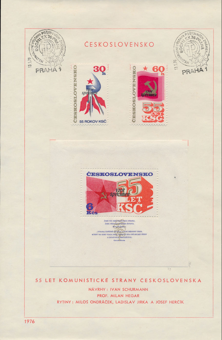 К каталогу был приложен сувенирный листок с наклеенной на нём серией из двух марок и блока, посвящённых 55-летию КПЧ. Поскольку на момент открытия выставки эти марки и блок ещё не вышли в обращение, на них была сделана надпечатка «Образец» на чешском и английском языках[4][10].
