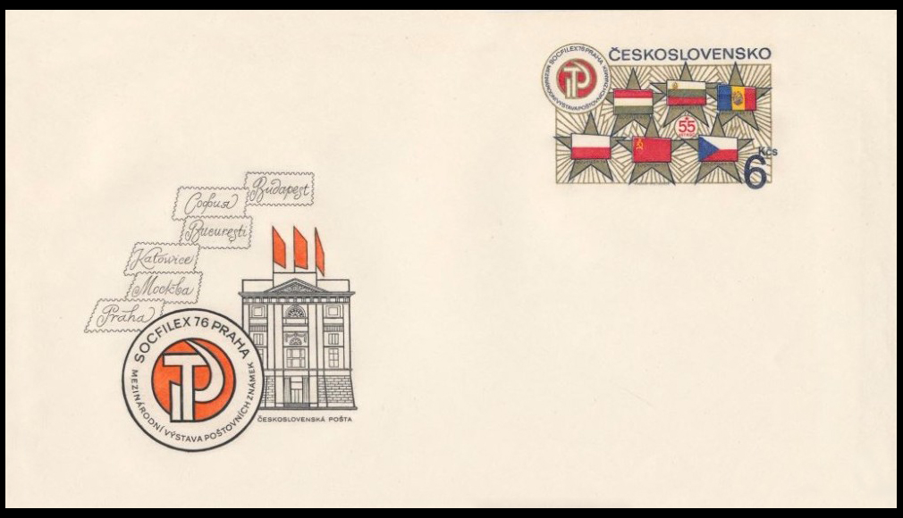 В память о выставке «Соцфилэкс-76» Министерство связи ЧССР выпустило художественный маркированный конверт с оригинальной маркой достоинством в 6 крон, разработанной художником Владимиром Коваржиком и гравёром Яном Мрачеком. В качестве сюжета марки автор использовал флаги стран, где с 1963 года проводилась выставка «Соцфилэкс», расположив их на фоне золотой пятиконечной звезды. В левой части марки изображена эмблема МФВ «Соцфилэкс-76». На конверте изображён выставочный дворец «У Гиберну», эмблема выставки, а в перфорированных в виде марок квадратах написаны на языке оригинала названия всех городов, в которых проводилась выставка «Соцфилэкс»[11]. Дизайн этого конверта был использован в качестве обложки журнала «Филателия СССР» № 8 за 1976 год[4].