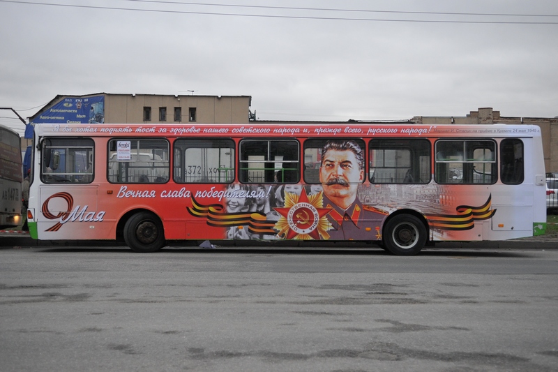 В 2010 году идею украсить к 9 мая автобусы Санкт-Петербурга портретами Сталина стал реализовывать блоггер Виктор Логинов (viklamist), опубликовавший в «Живом Журнале» макет раскраски автобуса. Добровольцы собрали деньги на проект, и первый украшенный автобус вышел на линию маршрута № 187-К в Санкт-Петербурге 5 мая 2010 года. Автобус был залит краской недоброжелателями акции, но был отмыт и снова вышел на маршрут.