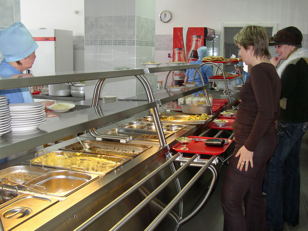 - в ряде столовых (с самообслуживанием — подносы и стойка/окно для подачи еды).