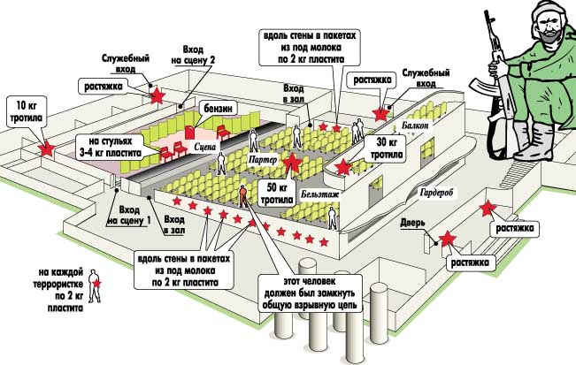 Четыре фугаса были заложены под опоры, удерживающие балкон и потолок, еще один — в центре зала. «Террористы планировали сначала подорвать фугас в центре зала, в результате чего погибла бы часть находящихся в помещении людей. Затем они намеревались подорвать опоры, чтобы обрушить балкон и потолок» — сказал источник в штабе.