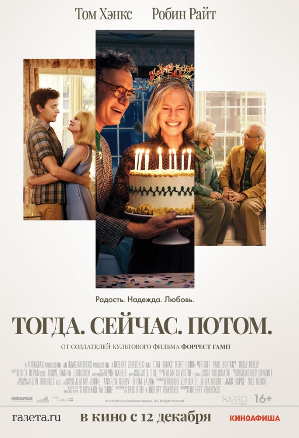 «Тогда. Сейчас. Потом» (англ. Here) — американский фильм 2024 года, поставленный режиссёром Робертом Земекисом[1] по его же сценарию, написанному в соавторстве с Эриком Ротом и Ричардом МакГуайром. Продюсерами фильма выступили Билл Блок и Эндрю Голов. Дон Бёрджесс выступил в качестве оператора фильма. Саундтрек к фильму написал Алан Сильвестри. В главных ролях: Том Хэнкс, >Робин Райт и Пол Беттани. Мировая премьера фильма состоялась 25 октября 2024 года.
