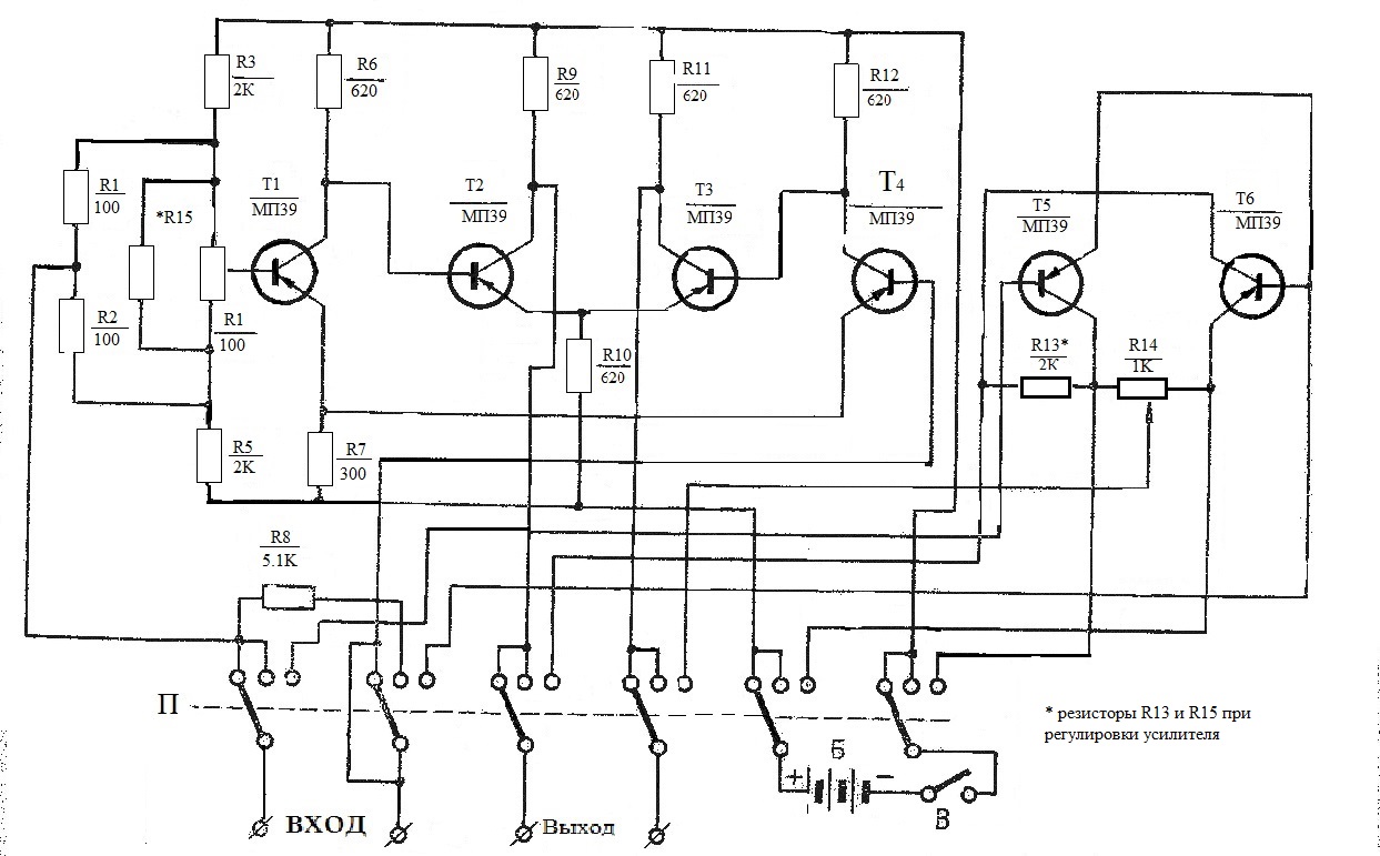 Усилитель собран на шести транзисторах типа МП 395. При крайнем левом положении переключателя П (на панели это положение «0») к входным зажимам прибора подключается усилитель, состоящий из двух балансированных каскадов на триодах Т1 Т2 Т3 Т4