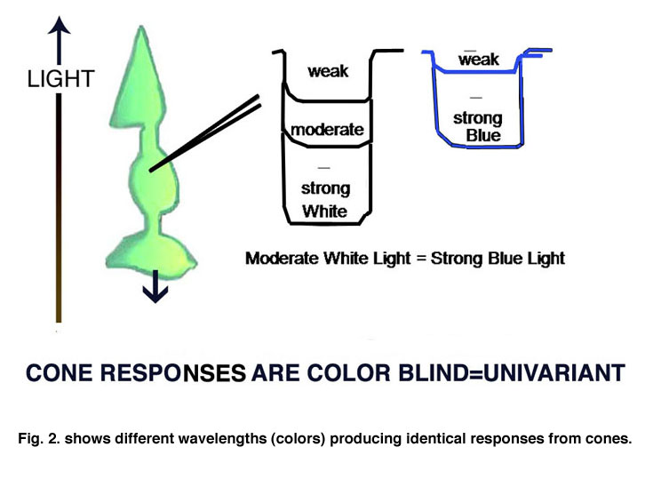 Колбочка только отвечает на энергию, которую она поглощает (Максвелл 1872). Полная длина волны света может произвести идентичные ответы колбочкой, если энергия, поглощённая колбочкой — аналогична для этой длины волны (рис. 2). Колбочки — страдающие дальтонизмом, создающие не адекватный (univariant) ответ, отражают только количество энергии, которую они поглощают. Обнаружение объектов энергии, отражённой от их поверхностей, может терпеть неудачу, когда объекты отражают подобное количество энергии как их фон. Вот — то, где цветное видение становится важным. Контраст длины волны может обнаружить объекты, когда контраст энергии отсутствует или минимальный. Объект может отразить ту же самую энергию, но редко отражает тот же самый состав длины волны в качестве его фона. Цветное видение комбинирует и энергию, и контрастирует длину волны, чтобы обнаружить объекты, и это преимущество, вероятно, развилось рано с развитием зрения. При дневном зрении колбочки воспринимают лучи света с длиной волны более 498нм. Палочки работают в условиях слабого освещения, но принимают более энергонасыщенные лучи синего и ультрафиолетового спектра с длинами волн менее 498нм. (См. Ретиномоторная реакция фоторецепторов сетчатки глаза).