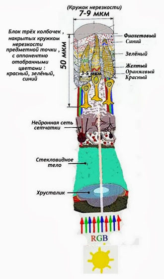 Откуда, биологическая оптическая зрительная система человека приспособлена создавать оптическое изображение, используя оптический дифракционно-нтерференцоный процесс фокусирования предметных точек на сферической фокальной поверхности сетчатки в трёх поясах с образованием базовового отрезка видимого спектра с длинами волн (400-700нм) с центром максимальной длины волны L — 550нм с привязкой к центру центральной ямки фовея. (см. рис.1). Т.о. в любом месте сетчатки глаза сфокусированная предметная точка своим кружком нерезкости накрывает блок трёх колбочек, которые оппонентно выделяют один из основных, базовых монолучей RGB.