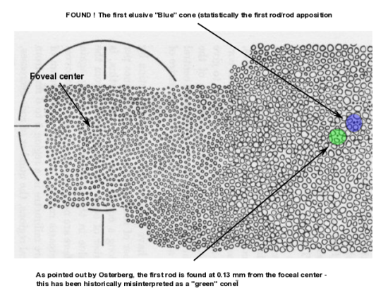 - 4) В первом поясе — центральной ямке расположены только красные и зелёные колбочки (M,L) без палочек, в пределах остальных поясов (второй, третий) расположены колбочки и палочки. При этом в радиусе 1,13 мм от центра, начало периферийной зоны очень плотно расположены Колбочки-S (синие) и остальные колбочки и палочки с фиксированной мозаикой расположения. По мере удаления от центра центральной ямки градиент плотности расположения колбочек уменьшаетя с иэменением их размеров, особенно внешней мембраны в сторону уменьшения диаметра поперечного сечения мембраны. (Это связано попадающими лучами света с меньшей длиной волны, но в пределах более 498 нм).
