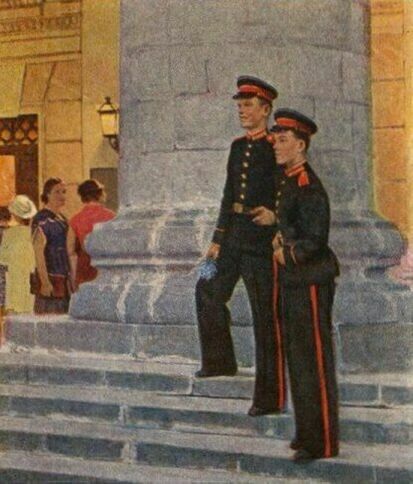Такая жанровая сценка — в чем-то уход от официозного советского искусства, по которому суворовцам положено готовиться к подвигам во имя Родины, где Родина — с большой буквы. Художника совершенно не волнует, что это будущие военные (а у них, между прочим, — новая, недавно введенная форма[4]), он увидел в них юных людей, просто людей, мечтающих о простом человеческом счастье, далеком от подвигов, геройств, служениях. И судя по всему, этих двух молодых людей сейчас не интересует ни театр, ни предстоящий спектакль (курсанты-суворовцы снабжались по государственной системе всем необходимым, в том числе и билетами в Большой театр) — они не театралы и не меломаны, а просто, получив билеты в Большой театр, пригласили девушек. Не спектакль Большого театра интересует их, главное для них — чтобы девушки пришли наконец на свидание. Только лица этих двух юношей — главное в картине. Все остальное становится лишь ее фоном. А эту гамму психологических переживаний художник мастерски вырисовал, уйдя от официоза социалистического реализма.