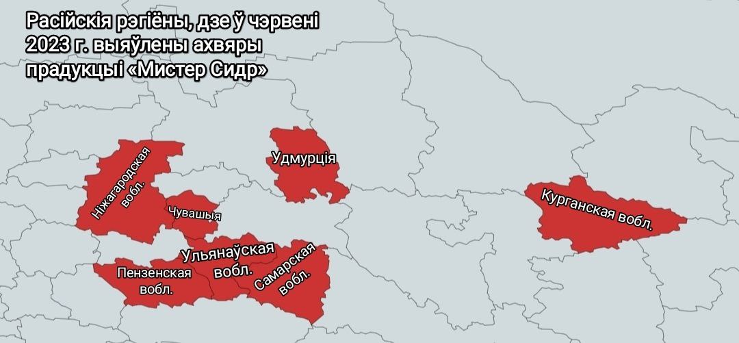 | Расійскія рэгіёны, дзе ў чэрвені 2023 года выяўлены ахвяры прадукцыі "Мистер Сидр". Створана удзельнікам DBatura пры дапамозе прыкладання MapChart. | |