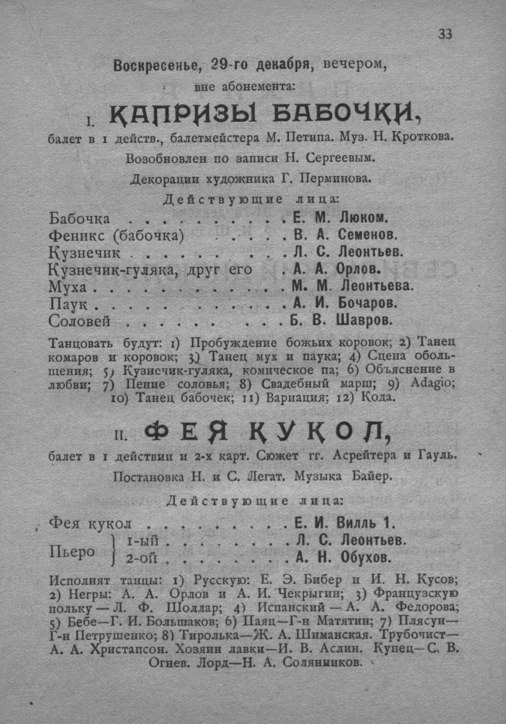 Сохранились документы, что этот балет шёл в Мариинском театре 29 декабря 1918 года[11] в одном представлении с балетом «Капризы бабочки».