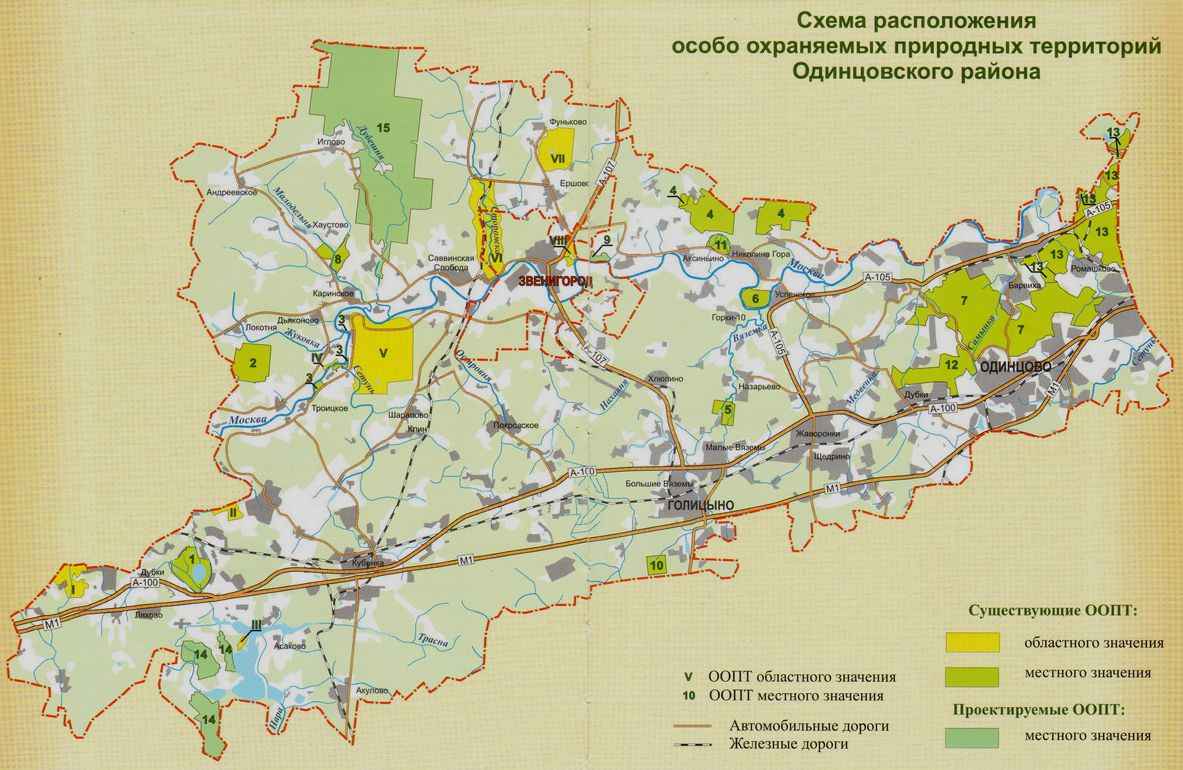 ООПТ местного значения — природные резерваты: «Озеро Палецкое», «Верховые болота лесных водоразделов рек Жуковка и Поноша», «Масловская лесная дача», «Долина реки Вязёмки», «Пойменный лес», «Хвойно-широколиственные леса водораздела рек Дубешни и Малодельни», «Озеро Рыбное — исток р. Вязёмки», «Аксиньинское болото», а также природные рекреационные комплексы: «Волковский берег», «Подушкинский лес», «Дубковский лес», «Леса Серебряноборского лесничества». Они созданы в соответствии со Схемой развития и размещения ООПТ местного значения в Одинцовском районе, разработанной в 2006 году.