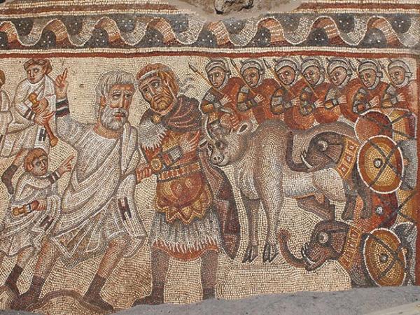 Мозаика синагоги Хукока. По одной версии, здесь Симон Праведный отказывает Александру Македонскому в статуе в Иерусалимском Храме. По другому толкованию, это Маттитьягу с пятью сыновьями-маккавеями выступает против Антиоха IV Эпифана.