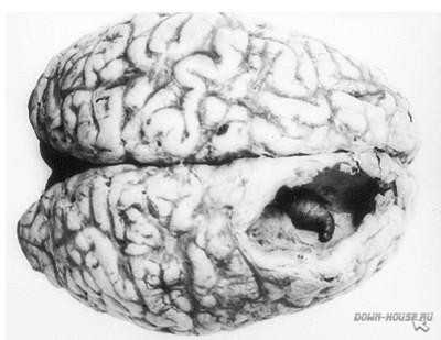 В редких случаях, личинки мух и оводов проникают в мозг, вызывая интрацеребральный миаз. В одних случаях, личинки проникают в головной мозг в следствии травмы головы (например, личинки Lucilia sericata). Личинки оводов (Hypoderma bovis и Dermatobia hominis) возможно заносятся в мозг по кровеносным сосудам, либо вползают мигрируя в тканях человека. Возникают судороги, боль, рвота, возможен летальный исход.