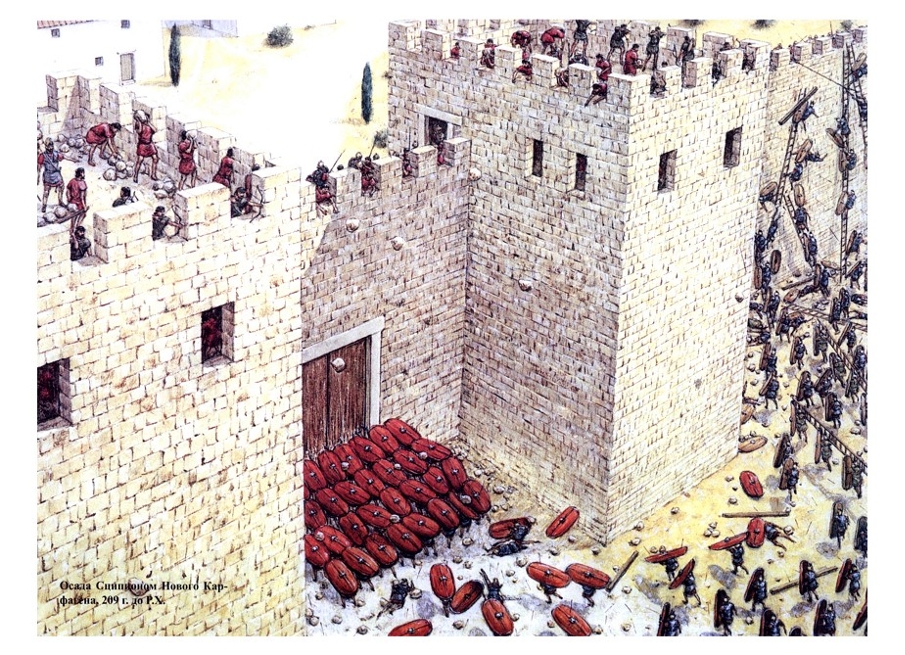 Тем временем, карфагенские солдаты вновь заняли стены. У них было более чем достаточно дротиков, запасённых в огромном количестве. Стены города были очень высоки, и немногие лестницы доставали их верха, а чем выше были они, тем не надёжнее. Первый солдат ещё не успевал добраться доверху, как за ним уже лезли другие: лестницы подламывались под их тяжестью; у некоторых солдат от высоты темнело в глазах, и даже с лестниц, стоявших крепко, люди валились наземь. Повсюду падали римляне и их лестницы — карфагеняне торжествовали, ободрились и повеселели. Тогда и дан был римлянам отбой. осаждённые воспрянули духом: «город не взять ни лестницами, ни осадой: укрепления надежны, и у карфагенских полководцев будет время прийти на помощь городу»[27].