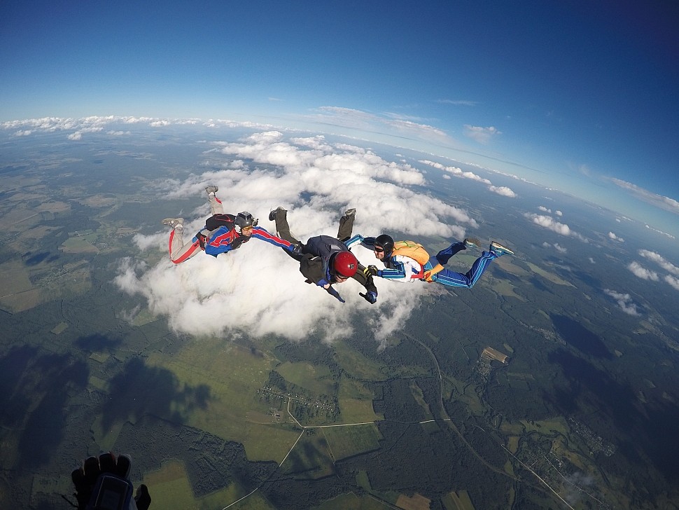 - 1-3 уровни — прыжки с двумя инструкторами. На этом этапе курсант осваивает правильную позу для выполнения стабильного падения — так называемую «коробочку», а также учится самостоятельно раскрывать парашют и выполнять безопасное касание земли.