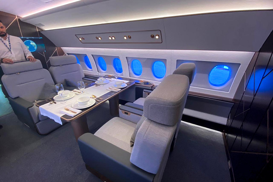 Салон самолёта разделён на три основные зоны — обеденная комната, переговорная и спальня. Каждая из них представляет собой изолированный отсек[7].