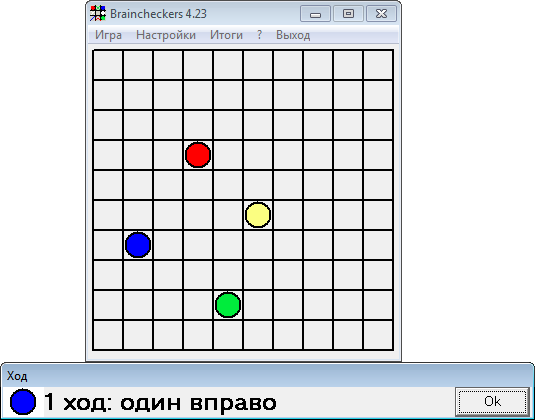 Далее шашки на экране исчезают и программа предлагает перемещать в своём воображении эти шашки в разных направлениях на определённое число клеток.