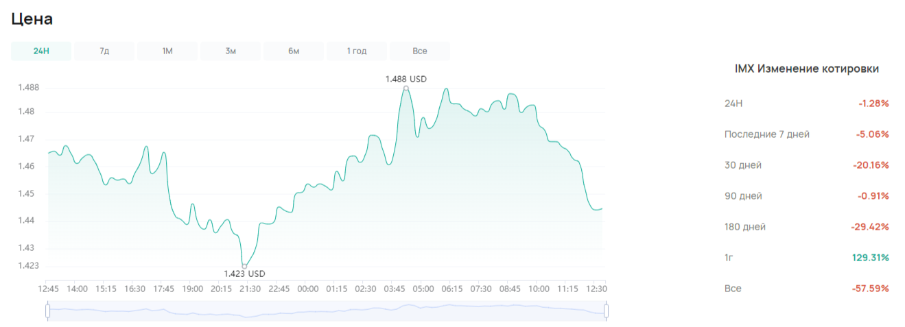 В конце октября 2024 года по данным биржи CoinEx курс криптовалюты колебался в диапазоне 1,423 — 1,488 доллара за 1 IMX. Всего в обращении находилось 1,63 млрд монет (максимальное предложение — 2 млрд токенов), рыночная капитализация достигла 2,36 млрд долларов[7][8].