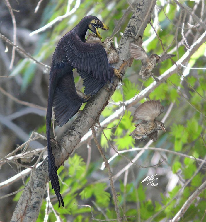 Микрораптор охотится на примитивных птиц синорнисов (Sinornis) — тоже четырехкрылых.