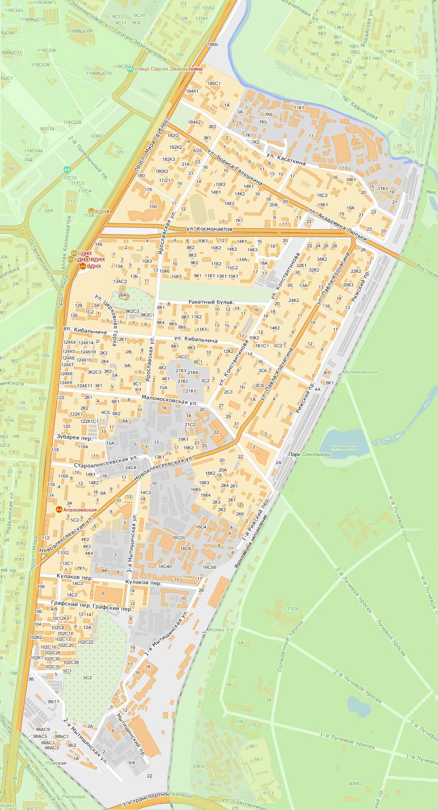Графский переулок • Дроболитейный переулок • Зубарев переулок • Касаткина • Кибальчича • Константинова • Кулаков переулок • Кучин переулок • Маломосковская • 1-я / 2-я / 3-я Мытищинская • Мытищинский проезд • Ракетный бульвар • 1-й Рижский переулок • Рижский проезд • Староалексеевская • Церковная Горка • Ярославская |