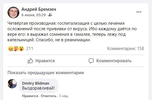 После публикации этого материала близкий друг Андрея Бремзена Владимир Кондратьев заявил «Ридусу», что категорически не согласен с оценками Алексея Бондала. «До получения результатов судебно-медицинского исследования такого рода выводы („смерть как последствие прививки“) неуместны. Причину смерти нельзя определить до окончания всех исследований (примерно 40 дней)», — сообщил Кондратьев.