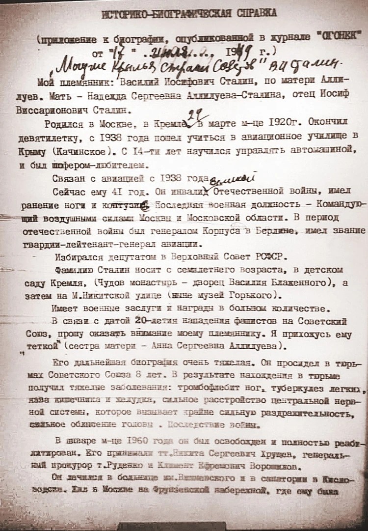 - ↑ 3,0 3,1 Аллилуев В. Сталин – Аллилуевы. Хроника одной семьи. — М., 1995. — С. 211.