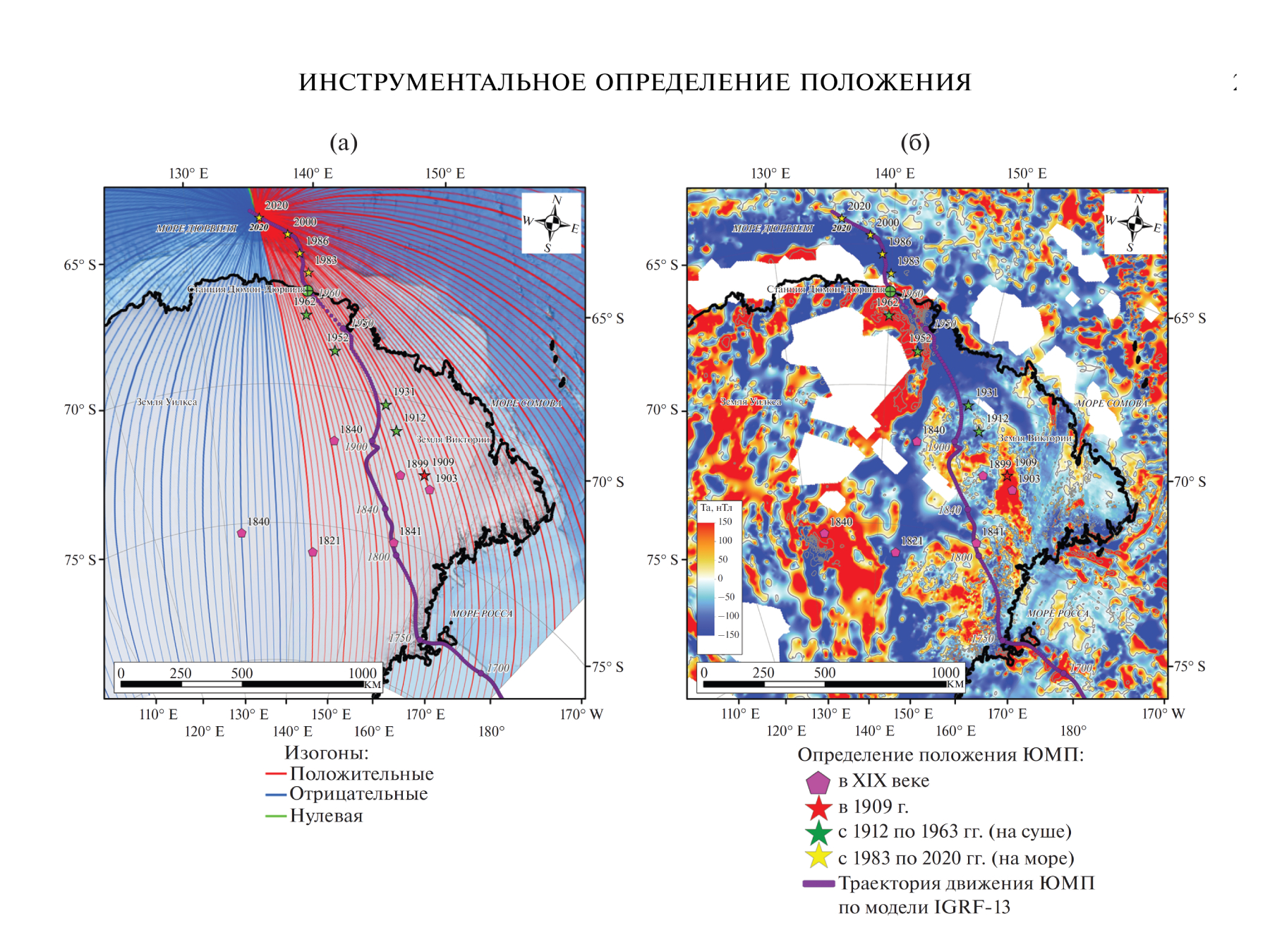 Факт того, что магнитные полюса представляют из себя географические точки на поверхности планеты был подтверждён в ходе антарктической экспедиции 2019–2020 года Военно-морского флота РФ при поддержке Русского географического обществав. В процессе ислледований был задействован комплекс высокоточных измерительных приборов (модульные протонные дифференциальные магнитометры, векторные трехкомпонентные феррозондовые магнитометры, судовой компас), при помощи которого были определены, по состоянию на 2020 год, географические координаты 64°5′ ю.ш. и 135°48′ в.д. Южного магнитного полюса с погрешностью ±5 км (см. рис. 6)[10].]